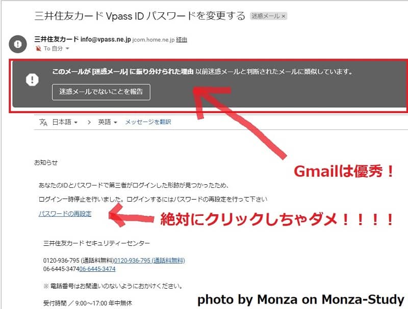 Gmailが迷惑メールに振り分けてくれなかったら、ひっかかりそうな、スパムメールが、また届いていました。Gmailありがとう!内容は、三井住友カードのパスワード変更を促すものです。念のためにネットで検索してみたら、案の定、公式サイトで注意喚起されていました。