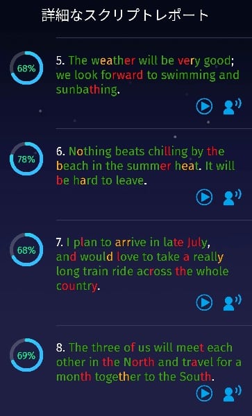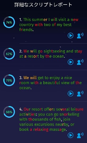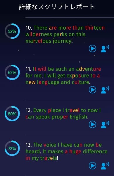 診断テストを受けると、詳細なスクリプトレポートを見る事ができます。自分の苦手な発音が一目瞭然で分かります。模範音声と自分の音声を聴き比べて、何度も練習することができる機能もあります。これが無料なんですよ。