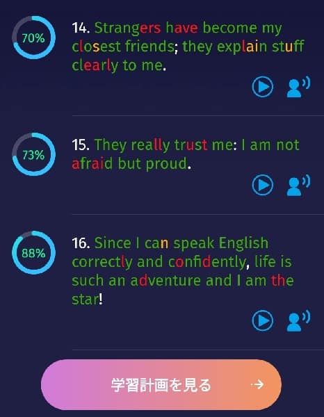 日本語対応だし、iOS、androidの両方OK。有料プランもありますが、無料でかなり詳細な発音診断をしてくれます。自分の苦手が数値で可視化されるのは、改善目標が明確になって非常に良かったです。とりあえず苦手な発音を矯正するために1日10分を1週間継続し、続けられそうなら有料プランを検討します。