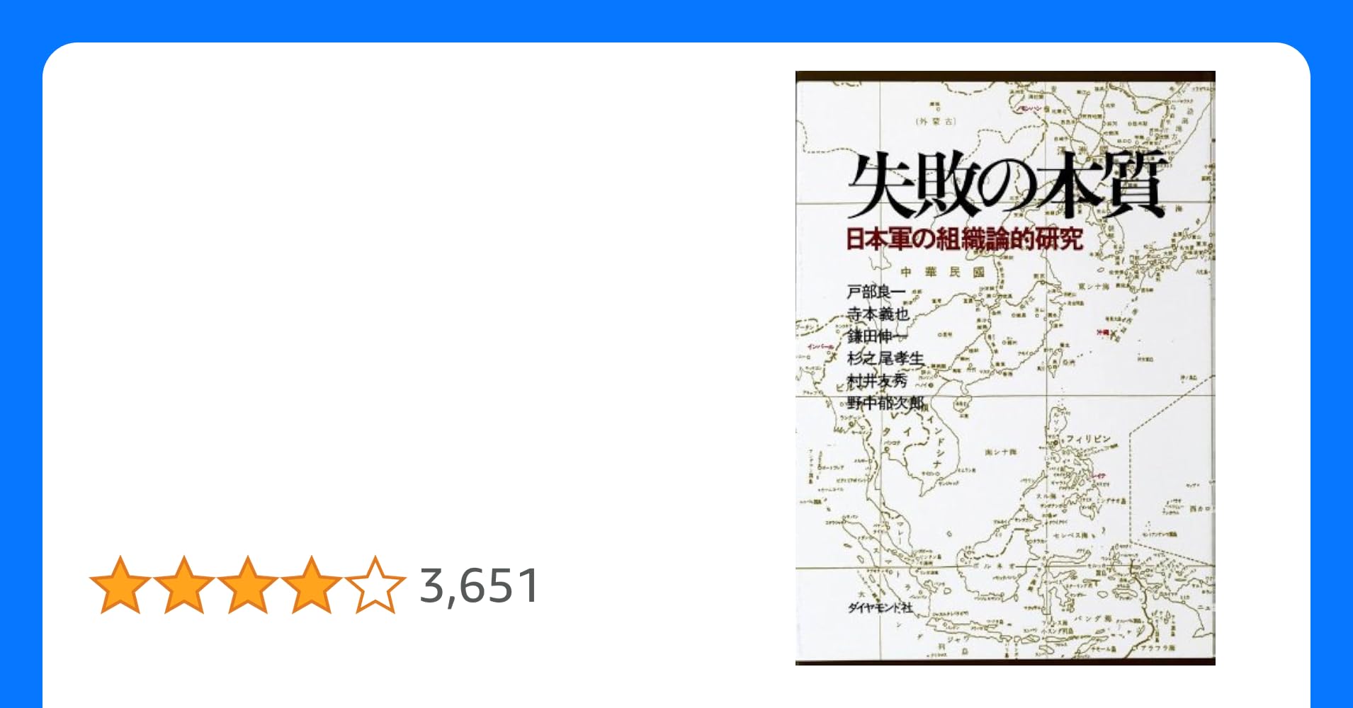 1 | 失敗の本質 Kindle版 | 戸部 良一 (著), 寺本 義也 (著), 鎌田 伸一 (著), 杉之尾 孝生 (著), 村井 友秀 (著), 野中 郁次郎 (著) | ダイヤモンド社 | 敗戦の原因は何か? 今次の日本軍の戦略、組織面の研究に新しい光を当て、日本の企業組織に貴重な示唆を与える書。ノモンハン事件、ミッドウェー作戦、ガダルカナル作戦、インパール作戦、レイテ沖海戦、沖縄戦という大東亜戦争における6つの作戦の失敗の原因を掘り下げ、構造的問題と結びつけた日本の組織論の金字塔。 | 742 | 失敗する組織について学びたかった | 391.3 |