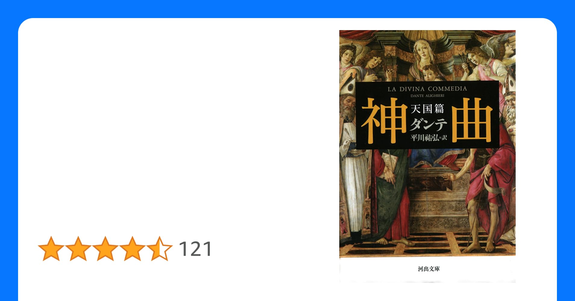 6 | 神曲 天国篇 (河出文庫) Kindle版 | ダンテ・アリギエーリ (著), 平川祐弘 (翻訳) | 河出書房新社 | 三昼夜を過ごした煉獄の山をあとにして、ダンテはペアトリーチェとともに天上へと上昇をはじめる。光明を放つ魂たちに歓迎されながら至高天に向けて天国を昇りつづけ、旅の終わりにダンテはついに神を見る。「神聖喜劇」の名を冠された、世界文学史に屹立する壮大な物語の完結篇、第三部天国篇。巻末に「詩篇」を収録。 | 1,000 | 地獄篇、煉獄編を読了。読み解く技法の課題本 | 971 |