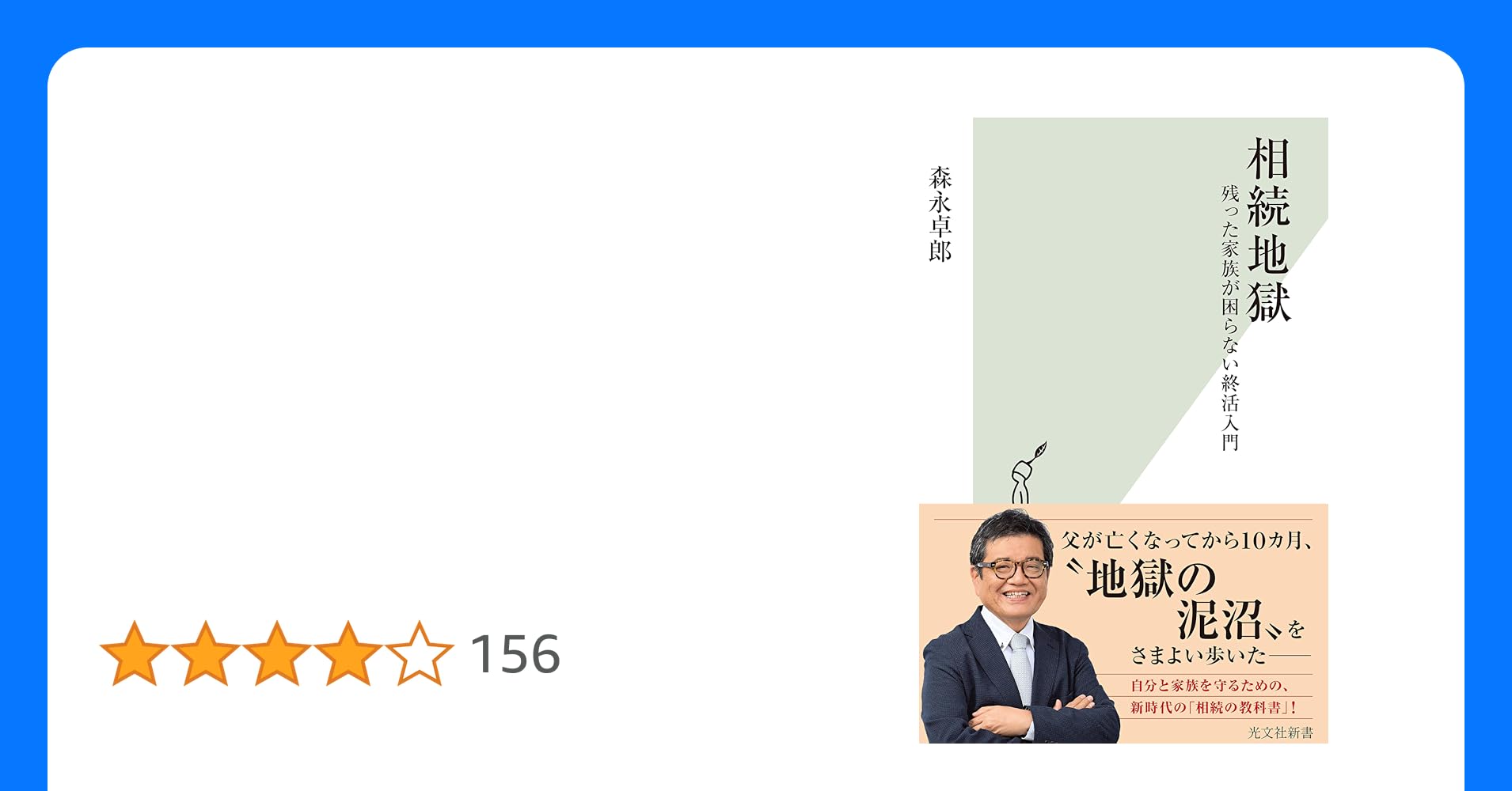 5 | 相続地獄~残った家族が困らない終活入門~ (光文社新書) Kindle版 | 森永 卓郎 (著) | 光文社 | ある日突然ふりかかり、一歩間違えると泥沼にはまる相続問題。自身の経験をもとに、今日からできる森永流・生前整理術を伝授する。“争続”を未然に回避するためのノウハウが満載。 | 836 | 相続トラブルに興味がある | 324.7 |