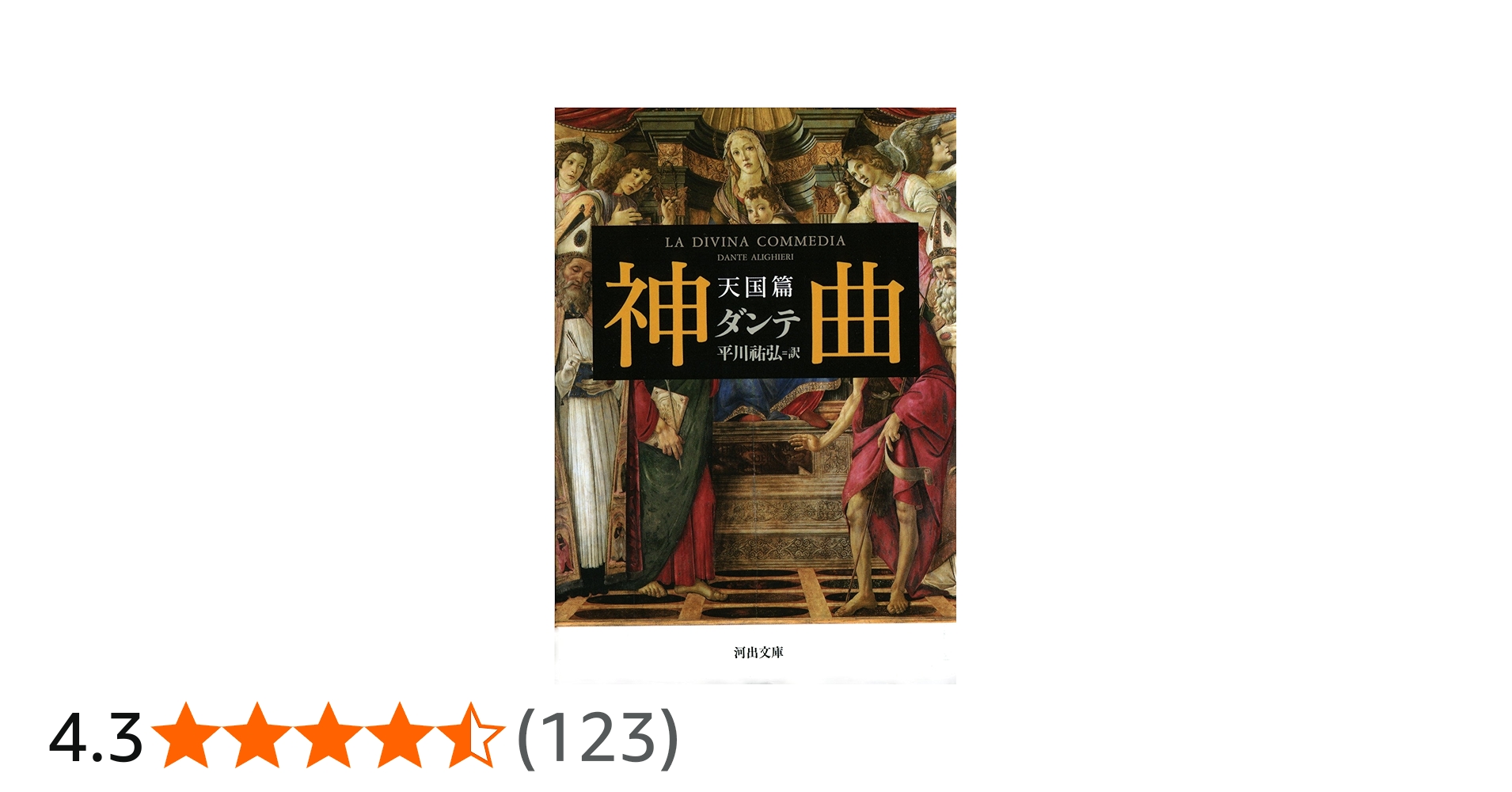 | 6 | 神曲 天国篇 (河出文庫) Kindle版 | ダンテ・アリギエーリ (著), 平川祐弘 (翻訳) | 河出書房新社 | 三昼夜を過ごした煉獄の山をあとにして、ダンテはペアトリーチェとともに天上へと上昇をはじめる。光明を放つ魂たちに歓迎されながら至高天に向けて天国を昇りつづけ、旅の終わりにダンテはついに神を見る。「神聖喜劇」の名を冠された、世界文学史に屹立する壮大な物語の完結篇、第三部天国篇。巻末に「詩篇」を収録。 | 1,000 | 地獄篇、煉獄編を読了。読み解く技法の課題本 | 971 |