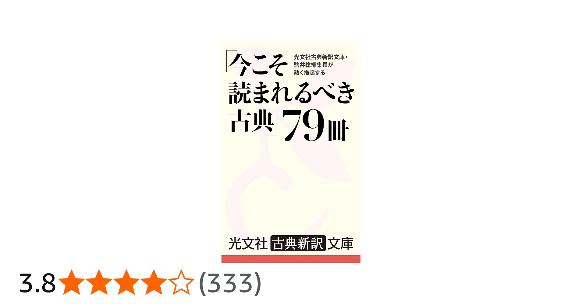 | 3 | 光文社古典新訳文庫・駒井稔編集長が熱く推奨する「今こそ読まれるべき古典」79冊 Kindle版 | 光文社古典新訳文庫編集部 (著) | 光文社 | 「いま、息をしている言葉で」をキーワードに、2006年に創刊された「光文社古典新訳文庫」。ミリオンセラー「カラマーゾフの兄弟」など話題作を次々に世に送り出した、人気レーベルです。誰もが知る古典の名作から、知る人ぞ知る南米やアフリカ等の隠れた傑作までも、読みやすい新訳でお届けしています。このカタログ本では、編集長自らが厳選した「今読むべき79冊」をご紹介。 | 0 | 次に読む古典を探すため | 903 |