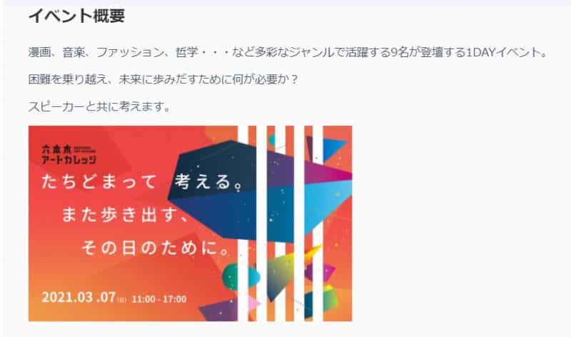 「たちどまって、考える。また歩き出す、その日のために」これが2021年六本木アートカレッジのキャッチフレーズです。