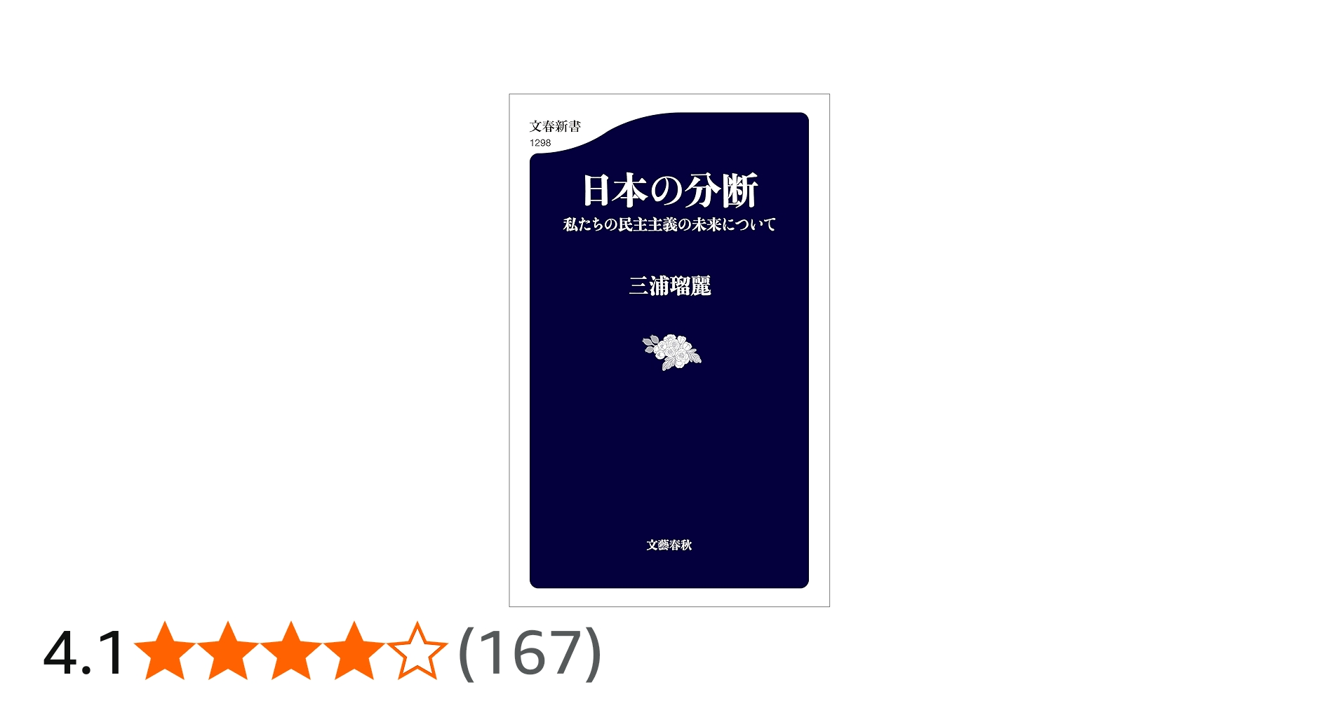 | 6 | 「日本の分断」 私たちの民主主義の未来について | 三浦 瑠麗 (著) | 文春新書 | 経済政策は選挙結果と関係がない? 実は外国人に寛容? 男女平等は世代を超えて支持? 日本人が求める「平等」と「競争」とは? 独自の意識調査によって日本人の価値観をあぶり出し、幅広い視点から日本社会を読み解く。 | 880 | ? | 312.1 |