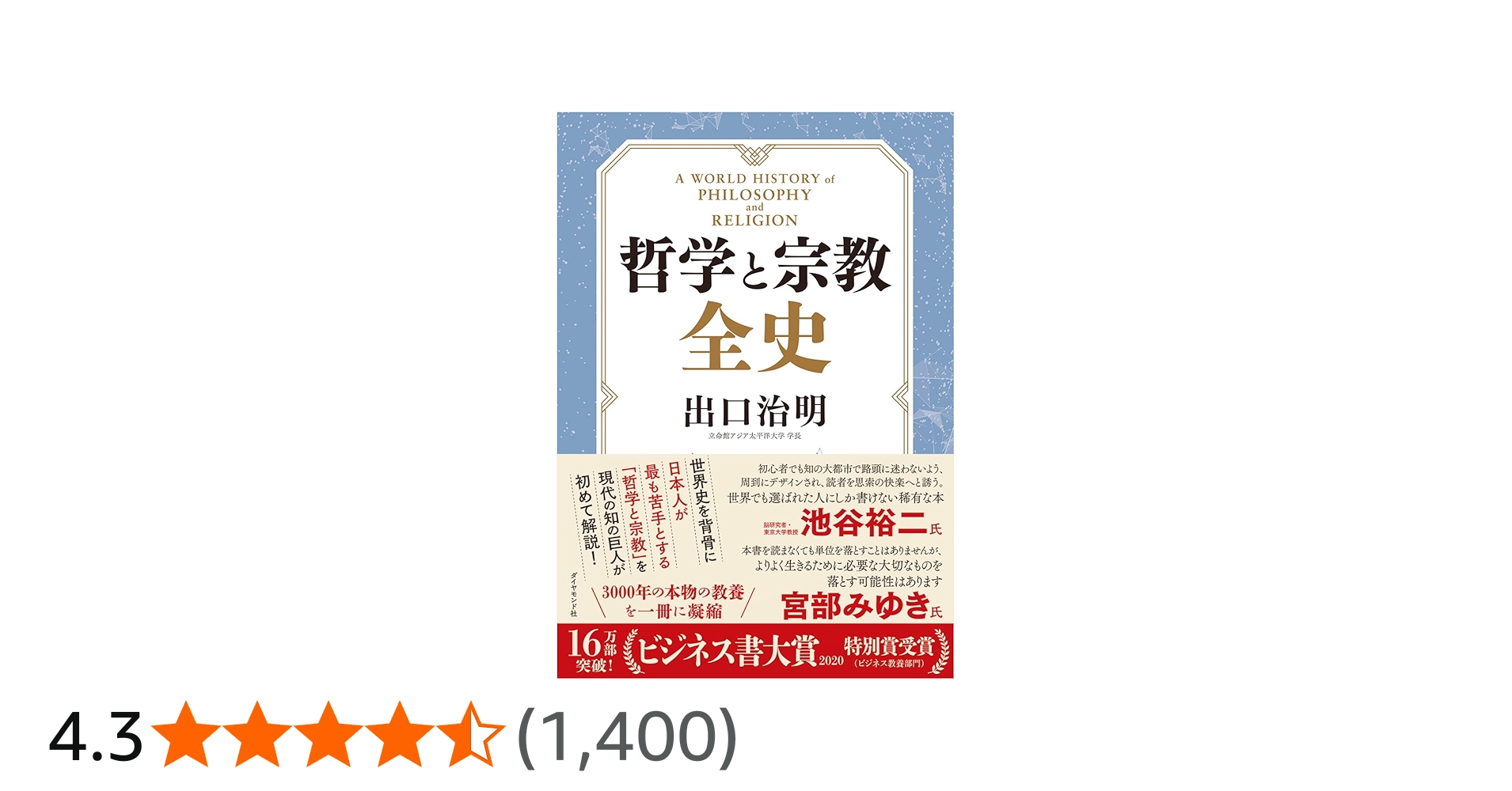 | 9 | 哲学と宗教全史 | 出口 治明 (著) | ダイヤモンド社 | ライフネット生命創業者で、立命館アジア太平洋大学学長の出口治明が、日本人最大の弱点「哲学と宗教」を世界史を背景に解説する。100点以上の哲学者・宗教家の肖像も掲載。折込みの年表付き。 | 2,138 | ? | 162 |