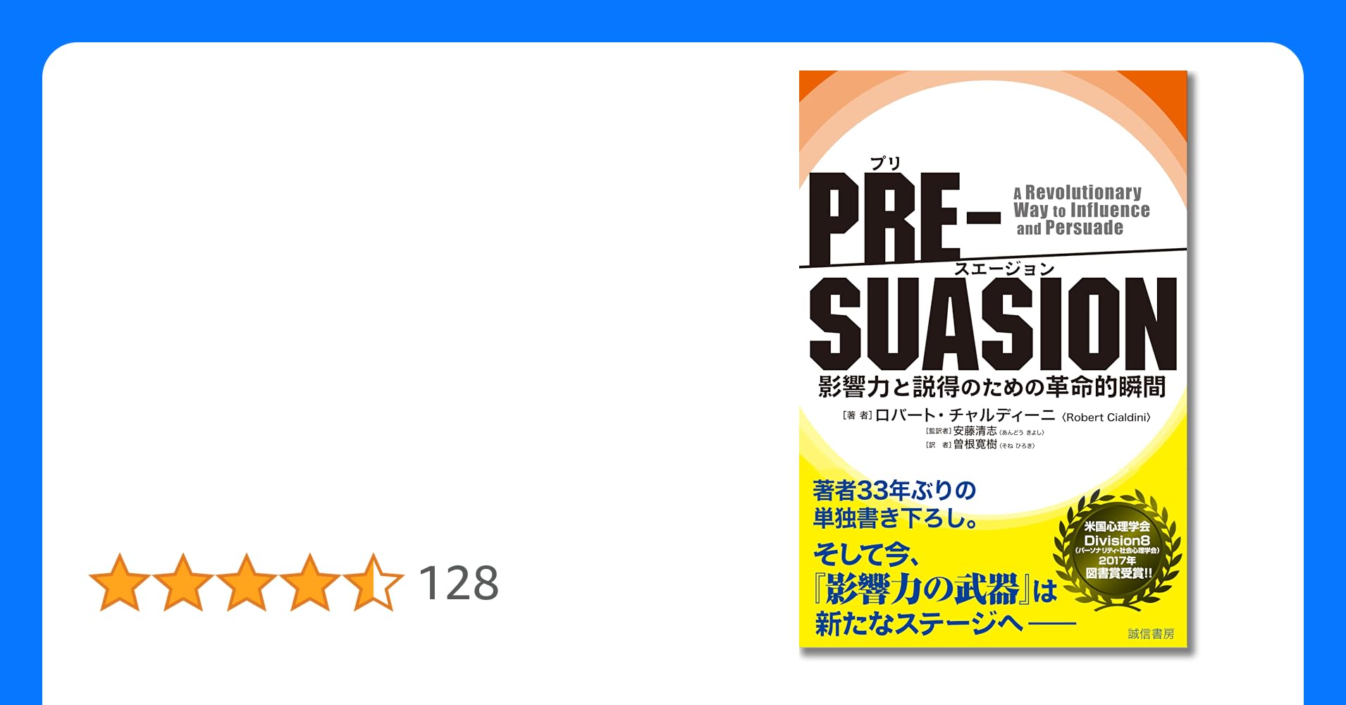 - Treeさん「PRE-SUASION :影響力と説得のための革命的瞬間」ロバート・チャルディーニ (著), 安藤 清志 (翻訳), 曽根 寛樹 (翻訳)誠信書房