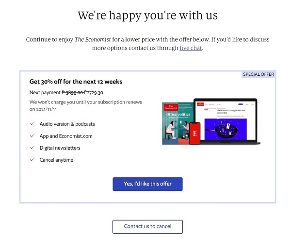 そして3ヶ月、英語の長文をスラスラと読むところまではムリでしたが、抵抗感はかなり薄れました。魅力的なデザインと記事の力が大きいでしょうね。音声読み上げも非常に充実しています。でも最初から、とりあえず12週間できるだけ読み、解約すると決めていたので、サブスクリプションをキャンセルしようとしました。