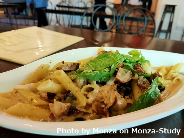 メニューを見たところ、けっこう良いお値段でしたが、2-3人でシェアすると考えれば妥当な価格かな。私はメディタレイニアンというペンネパスタを注文。無料のお水をくれたので、ドリンクは注文せず。クリームチーズ系で輪切りにしたグリーンとブラックのオリーブと燻製にしたような鶏肉がどっさり入っていました。緑の葉っぱは彩りとして少し入っていたくらい。野菜少なめ、塩分と脂肪分が高めですが、強い日差しで疲れた身体には美味しかったです。私は一人だったので、食べきれませんでした。