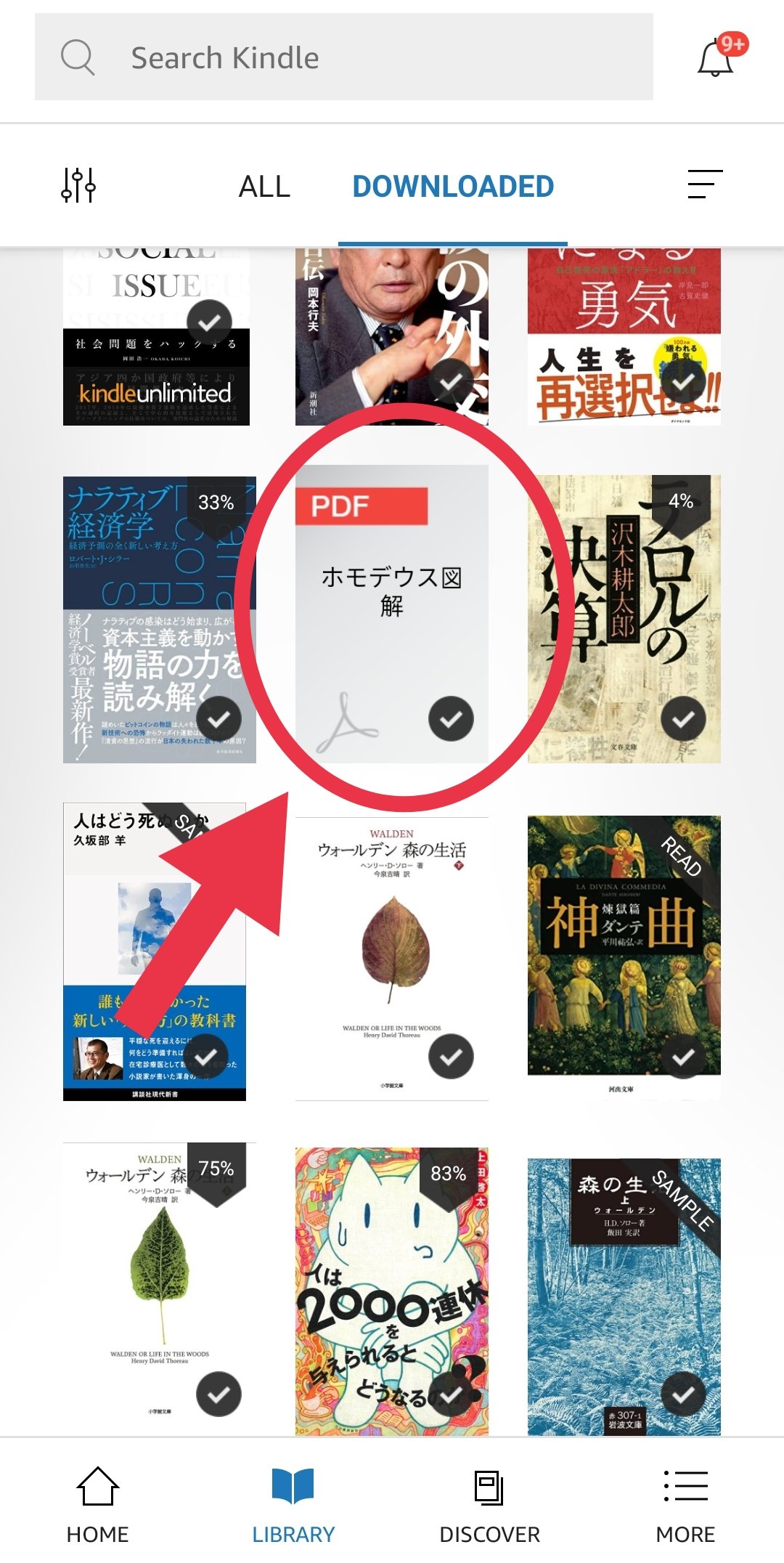 メール送信が完了したら、kindleアプリを開いてPDFが追加されているかを確認しましょう。私は、nogacchiさんのホモデウス図解を追加してみました。これ、非常に分かりやすく情報が整理されていて理解が進みました。ホモデウス、時々内容を確認したくなるんですよね。こちら、noteから無料でダウンロード可能です。nogacchiさん、素晴らしすぎます。ありがとう。