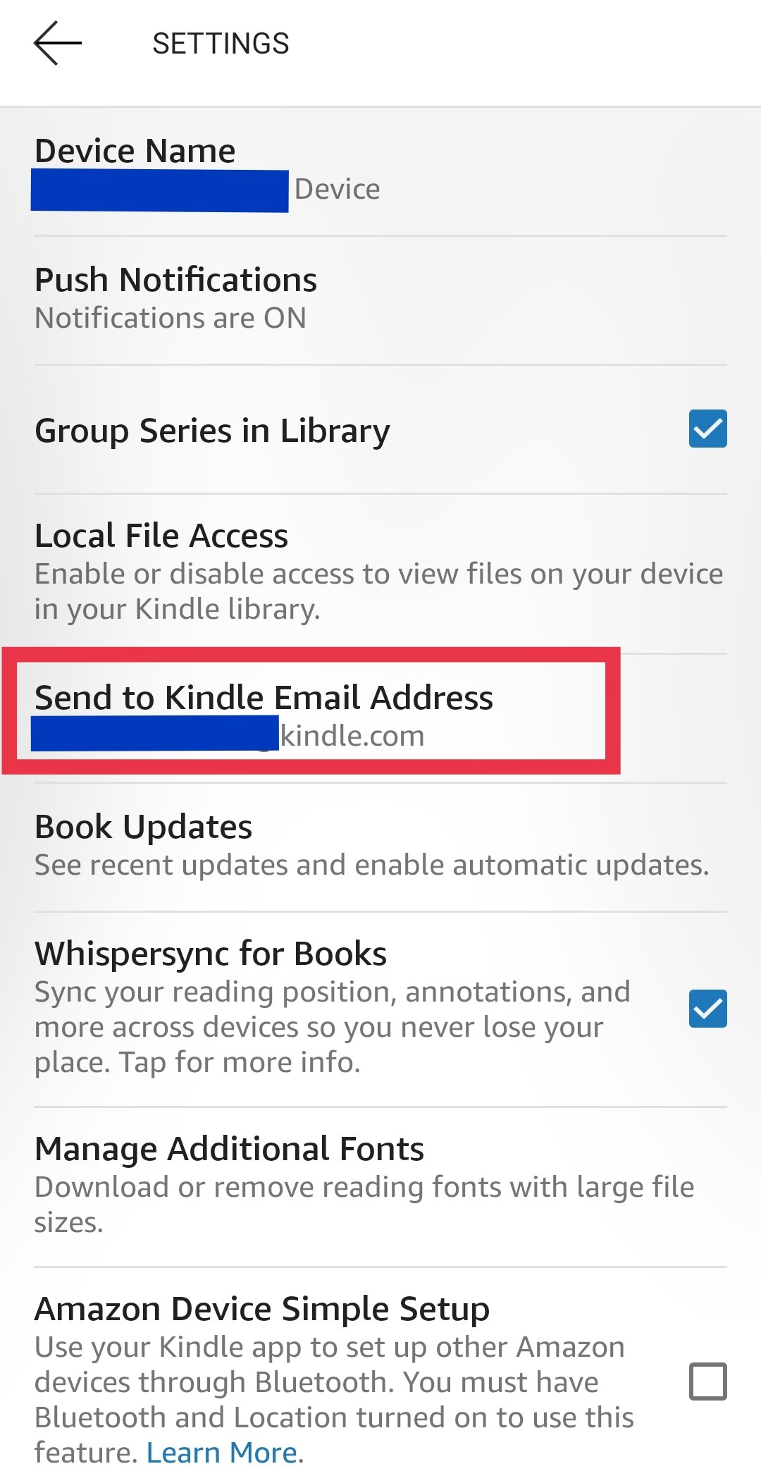 スマホでkindleアプリの設定を開くと、Send to Kindleという項目で、末尾に@kindle.comが記載されたメールアドレスを見つけることができます。