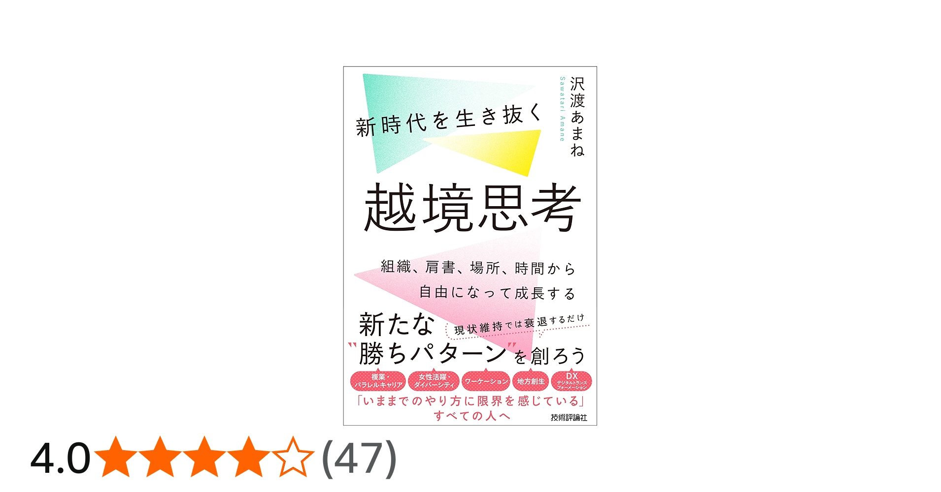<内容:アマゾン商品説明より> 「新時代を生き抜く越境思考 ~組織、肩書、場所、時間から自由になって成長する」沢渡 あまね (著) 技術評論社