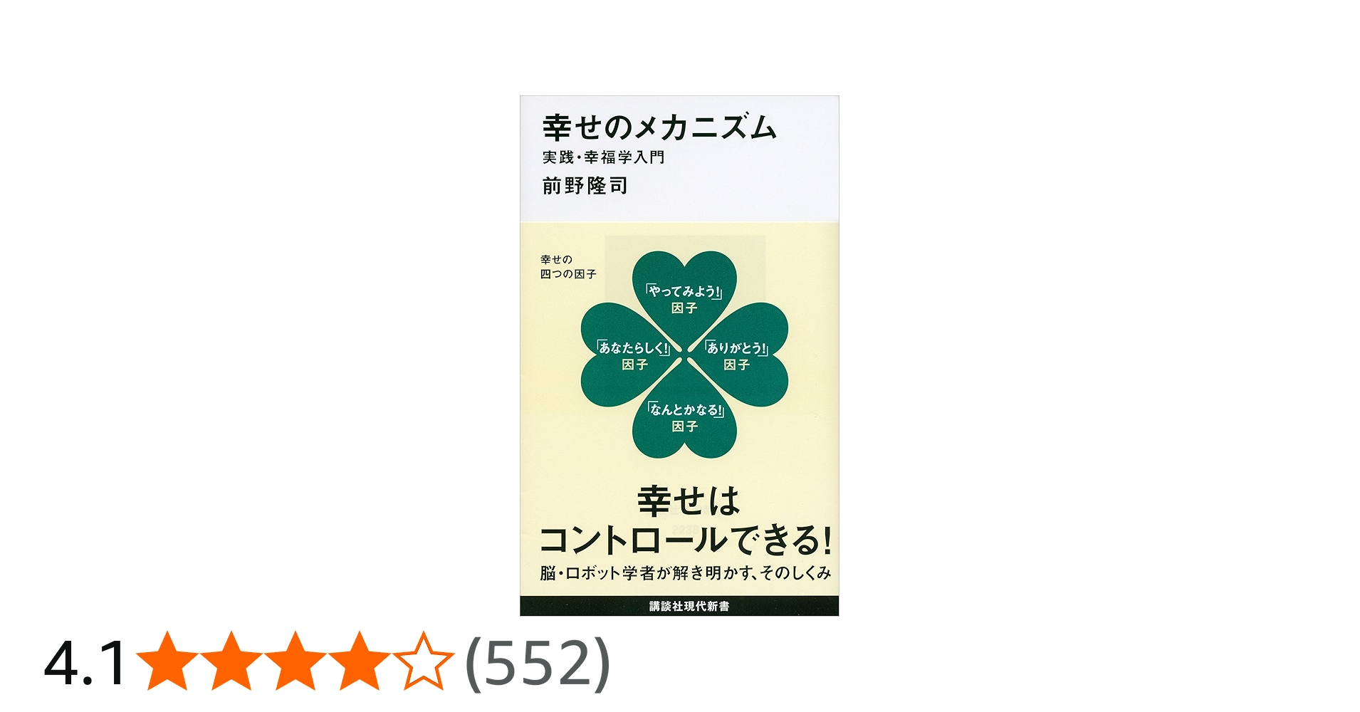 幸せはコントロールできる! 脳・ロボット学者が解き明かす、そのしくみ。個人の幸福追求、幸せにつながるビジネスのために。人類にとって役に立つ、学問としての体系的幸福学。幸せの四つの因子●「やってみよう!」因子●「ありがとう!」因子●「なんとかなる!」因子●「あなたらしく!」因子 (講談社現代新書)