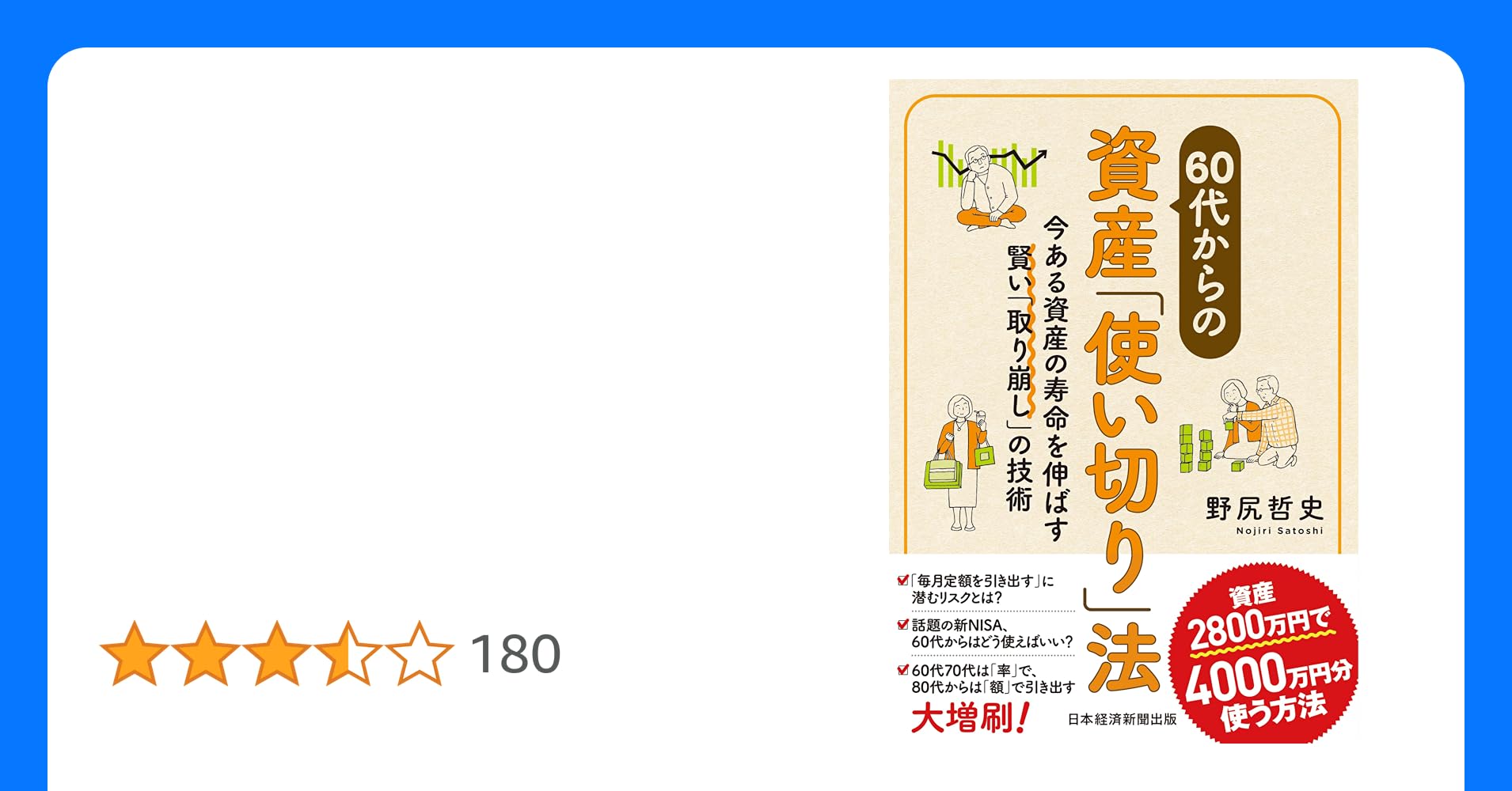 <内容:アマゾン商品説明より>『60代からの資産「使い切り」法 今ある資産の寿命を伸ばす賢い「取り崩し」の技術』 野尻哲史(著)日経BP