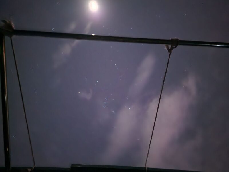 明るい月夜で蛍の光が弱いとガイドさんは説明してくれましたが、月とオリオン座、そして幻想的な蛍の光をボートの夜風。