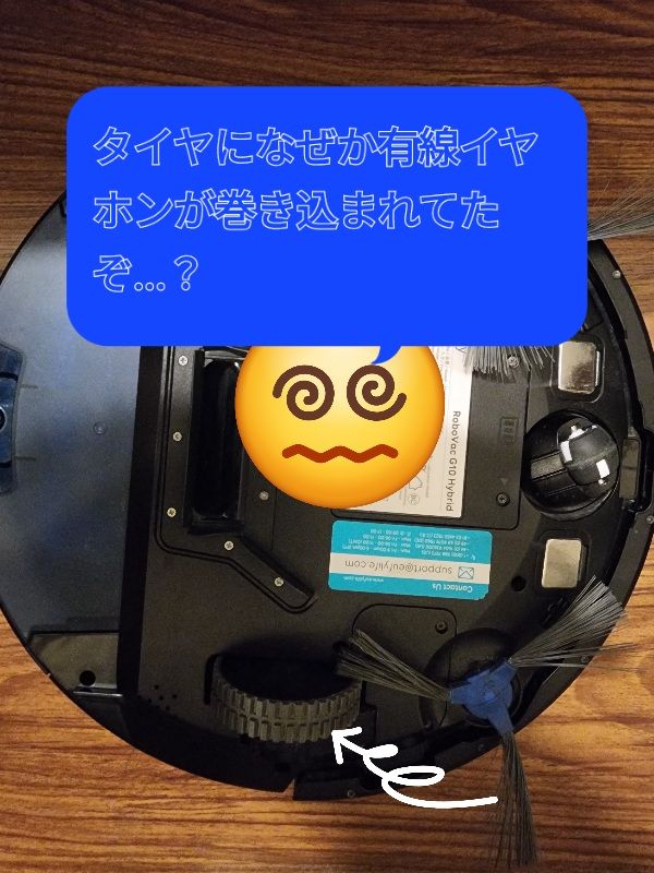 ロボット掃除機さんには大変お世話になっているのですが 時々 巻き込み事故が発生します。床に置いていたマットとかスリッパとか何度か 事故にあったので 最近は気をつけていたのですが、その辺に引っ掛けておいた 有線のイヤホンがなぜか床に落ちてしまっていたらしく久々に 巻き込み事故に遭っておりました。