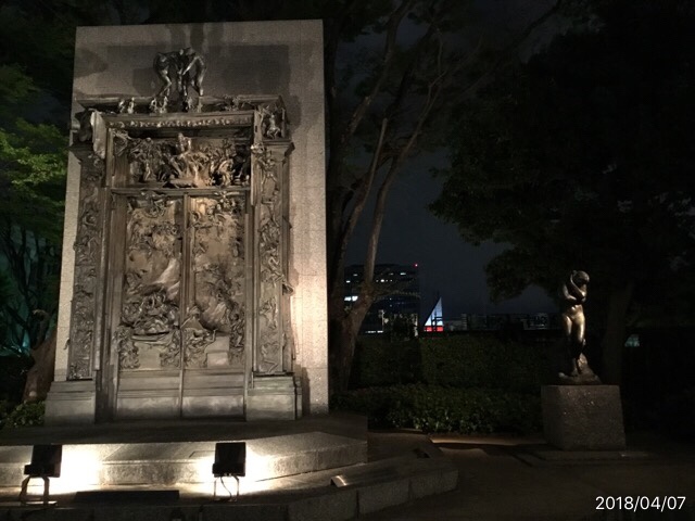 土曜の夜、21時閉館間際に博物館を出て、上野駅に向かいました。まっすぐ変える予定だったのですが、国立西洋美術館の前を通りかかると、まだ門が開いているではありませんか。こんなチャンスを見逃すわけにはまいりません。だって前庭にはロダンの彫刻があるんですよ。それを一人でじっくり眺められる機会なんて、そうそうありません。