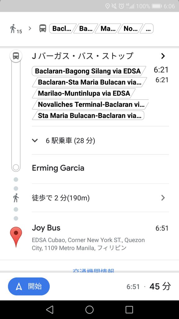 AM6:48 ところが、それが間違いだった。マニラのバスは出発後、しばらくしてから車掌さんが運賃の集金を始める。念のため、と「これ、Erming Garciaに止まりますか?」(私が乗る長距離バスのターミナルから一番近い停留所とGoogleマップで表示された地名)と聞いたら「止まらない」という。一瞬、青ざめたが、絶対にクバオには止まるはずだという確信があったので「クバオには止まりますよね?」と再度確認したら、そこには止まるという。クバオまでの料金13ペソを支払って気持ちを何とか落ち着けた。実は、下見のときもクバオで降りて、10分以上歩いたから、今回こそは、正しい場所で降りたいと思っていたのだが、またもや失敗である。