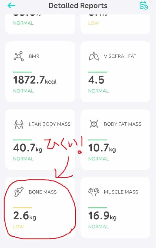 日本で使用していた体重計(無印良品で買ったTANITA製)では、骨密度が低いと表示されたことはなかったはずなので、まさか自分の骨密度が低くなっていることなど、想像もしていなかった。本当に驚いた。でも、この段階で分かって良かった。