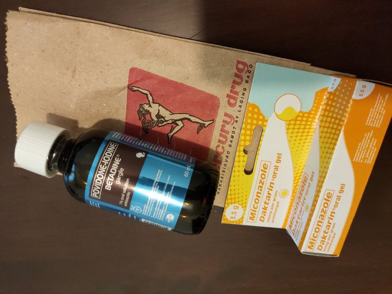 Daktarin oral gelが効くよ。2種類あるけど、どちらも同じ。治ったあとは2~3日、Povidone-iodine betadineでうがいしてね。Watosonsでも、Mercury薬局でも買えるよ。