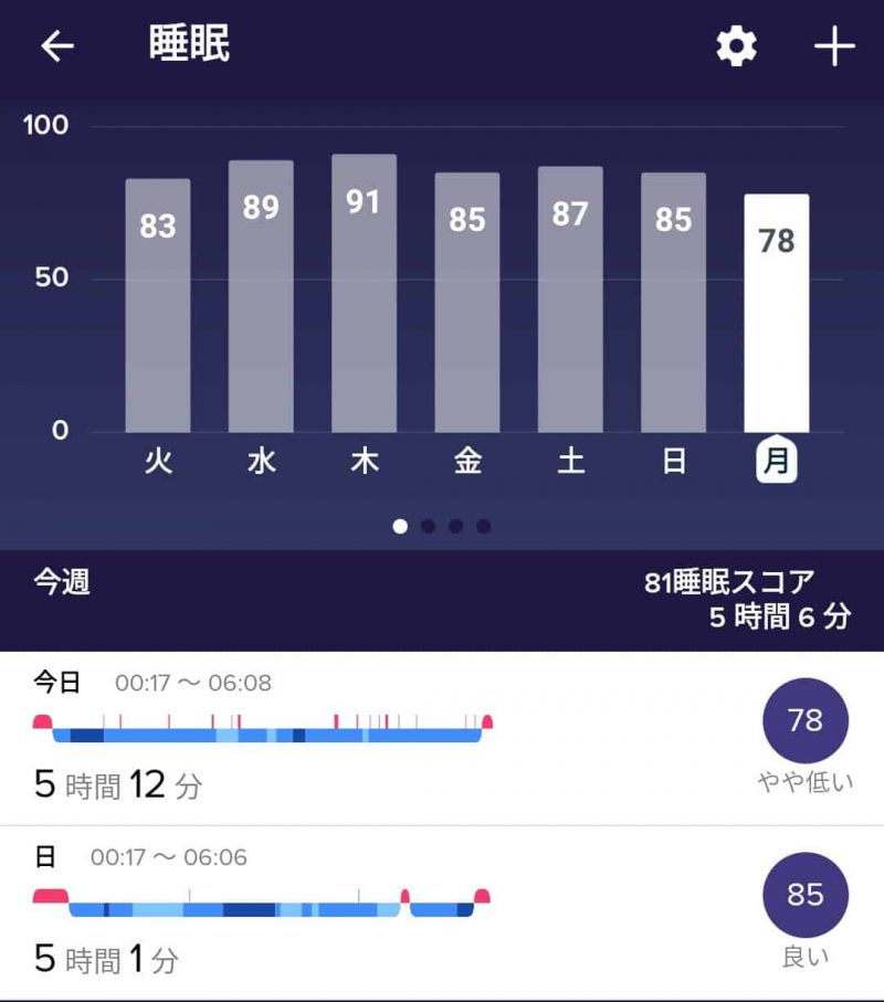 3~4時間しか寝ていない場合は、78点(やや低い)というスコアがでて、自分でも、やっちまったな、というのが分かるんですが、今回は5時間以上寝ているのに78点が出てしまい、あれれ?という感じだったんです。